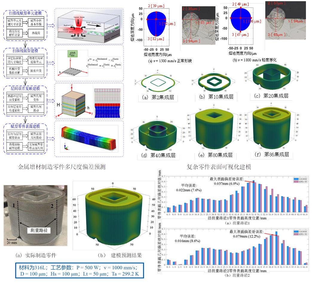 针对增材制造零件沿扫描路径赋型过程中,受到多物理现象耦合影响导致最终零件几何偏差难以预测的问题,提出融合金属增材制造的多尺度、多物理赋型机理,构建了增材制造零件的扫描赋型理论,突破了增材制造多尺度几何偏差建模与预测方法,实现了增材制造从熔池到零件的多尺度几何偏差预测。
