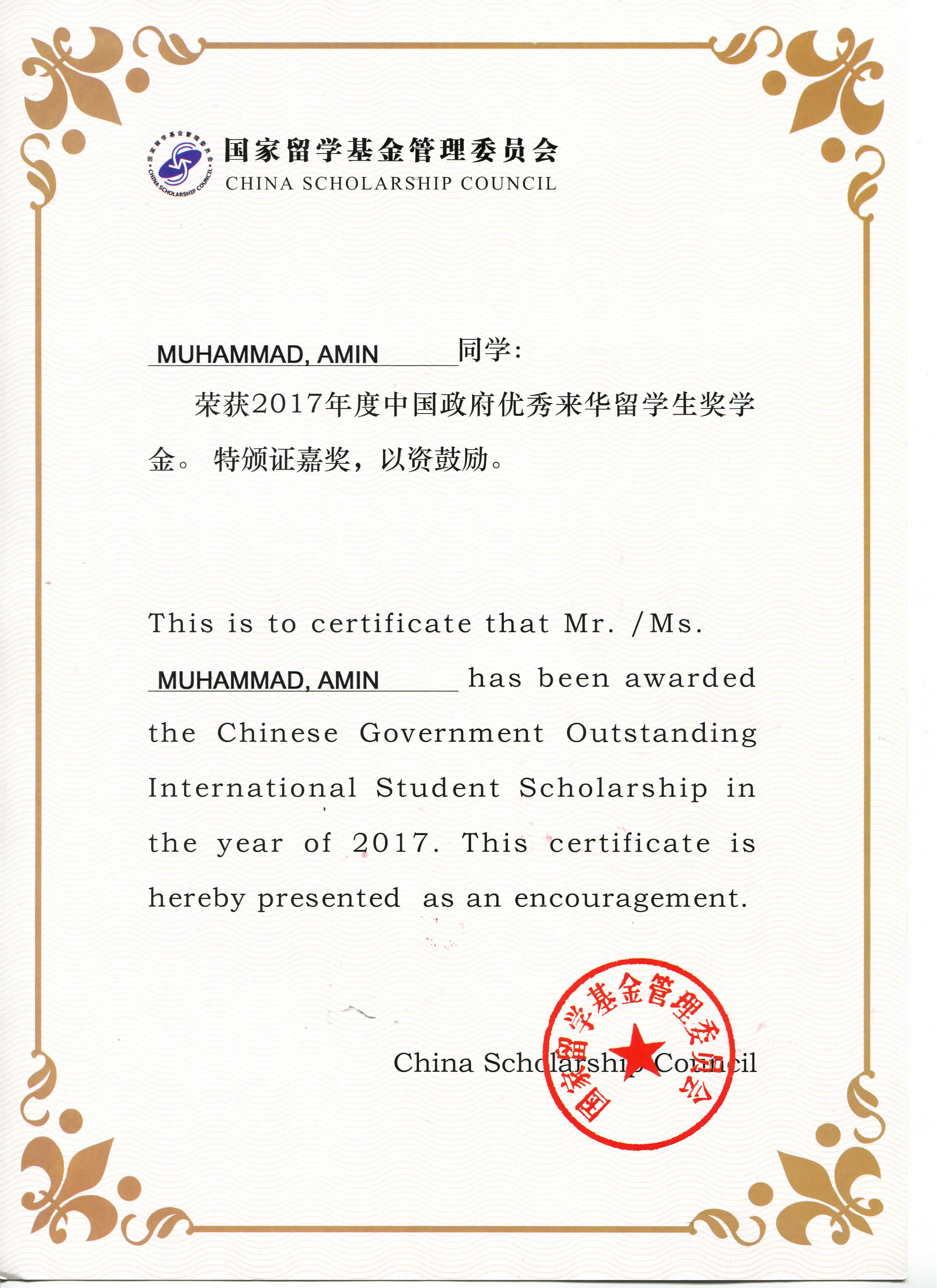 图2 Muhammad Amin同学的获奖证书
