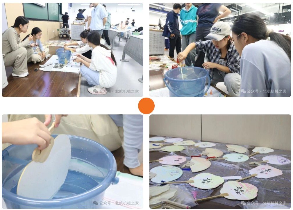 漆扇制作区里,同学们先将心仪的颜料滴入清水中,看着色彩在水面晕开浅浅纹路。随后,他们轻轻提起素白扇面,缓缓浸入水中再小心取出——刹那间,原本分散的颜料如灵动云霞般,在扇面上自然铺展、交融,晕出独一无二的纹路。无需刻意勾勒,每一把扇子都带着手作的温度,成为专属于制作者的中秋小礼。