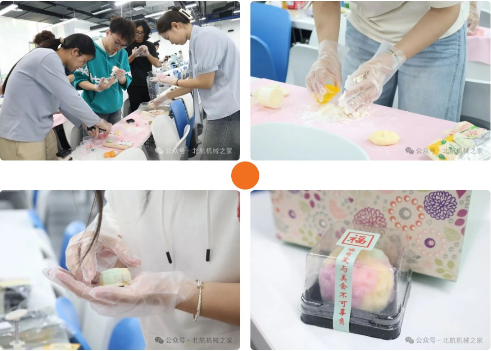 在冰皮月饼制作区里,多数同学是初次尝试,手法略显生疏,常有些手忙脚乱。好在志愿者耐心在旁示范指导,同学们也主动凑在一起交流技巧、互相帮忙。不多时,一个个圆润饱满的冰皮月饼便新鲜成型——通透的饼皮裹着清香内馅,晶莹得恰似夜空中皎洁的明月,既藏着手作的温度,也悄悄承载了同学们对远方家乡的牵挂。