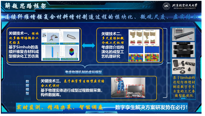 项目简介:本项目致力于构建连续纤维复合材料增材制造的高保真数字孪生系统,通过多物理场耦合仿真技术解决制造过程中的工艺不稳定性问题。基于Simdroid平台,建立覆盖“运动机构-材料挤出-沉积固化-热管理”全链条的模块化模型,集成多体动力学、流体力学、传热学和结构力学等多学科仿真能力,实现对树脂流动、纤维浸润、热力耦合变形等关键物理过程的精准映射。通过数字孪生技术为工艺优化、缺陷控制、性能预测和质量保障提供科学依据,推动连续纤维复合材料增材制造技术的产业化发展。