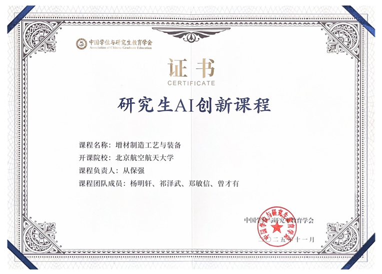 在2025研究生数智教育大会上,中国学位与研究生教育学会为21门研究生AI创新课程颁发证书。成人直播从保强教授团队《增材制造工艺与装备》课程入选。
