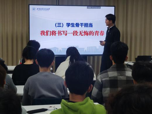 高磊以“努力成长为一名光荣的机械学工人”为题,开启学生骨干培训班的第一课。他结合成人直播