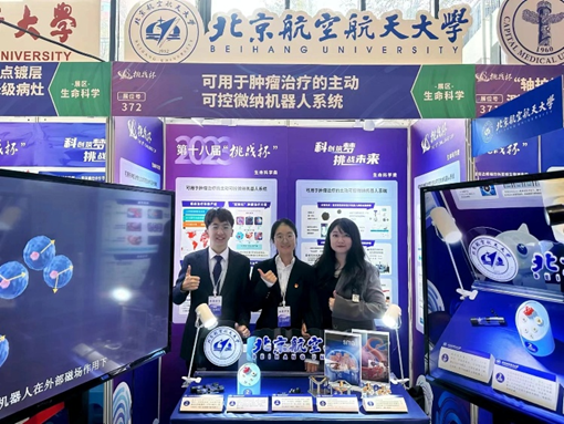 作为第一负责人,牵头团队参加第十八届“挑战杯”全国大学生课外学术科技作品竞赛,项目“可用于肿瘤治疗的主动可控微纳米机器人系统”斩获全国主题赛一等奖(全校唯二)。项目受邀作为全校十个代表项目之一,在“共青团中央徐晓书记主题教育调研北京航空航天大学”活动中现场展示与交流,将成果从实验验证推进到竞赛展示,提升项目影响力。