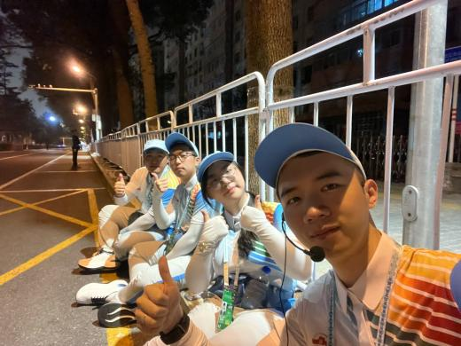 在本次活动中,她始终全心投入,活动前完成了包括“活动精神思想、岗位职责理论、专业服务礼仪”等全方面的系统培训,培训时间长、内容全。除此之外,她积极报名参与深夜演练,不论天气晴雨,均从当日中午开始待命,次日凌晨才返回校园,确保正式活动顺利进行。在正式活动当天,她深夜3点到岗准备,中午12点服务结束返程,在服务过程严格遵照从前培训和演练的要点要求,完成本职任务的同时做到热情、微笑服务。见证首都最深的夜,也陪伴首都最早的晨,真正做到在坚守中奉献自我,将“小我”融入“大我”。