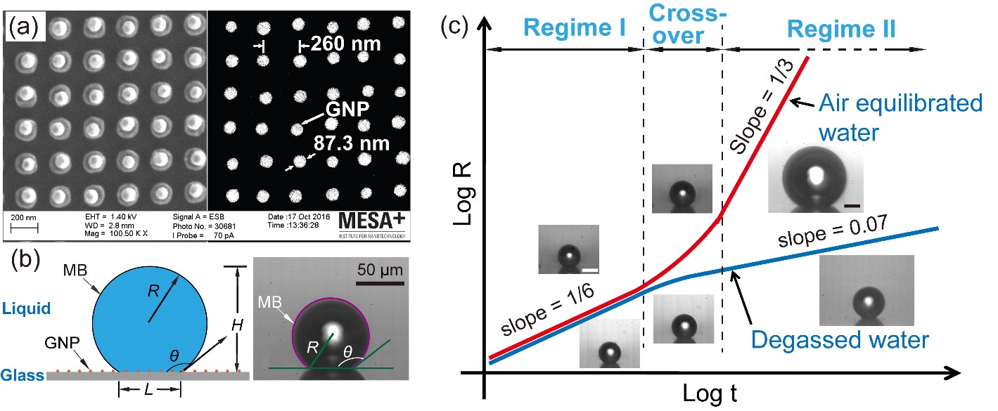 王玉亮副教授联合荷兰特温特大学以及澳大利亚皇家墨尔本大学的科研人员,利用超高速摄像机,在纳米金粒子结构化表面(图a)生成等离子气泡(图b)。通过观测等离子气泡产生的动态过程,在国际上首次揭示其产生机理。他们的研究表明,等离子气泡只有在产生后的大约10 ms以内主要由水汽组成(图c,Regime I)。而后,水中溶解的空气逐渐通过液气界面扩散,进入气泡中,并在随后的气泡生长环节起主要作用。这一研究结果,对其他等离子体气泡相关应用具有重要的指导意义,也为课题组下一步基于等离子体气泡的应用研究奠定了基础。