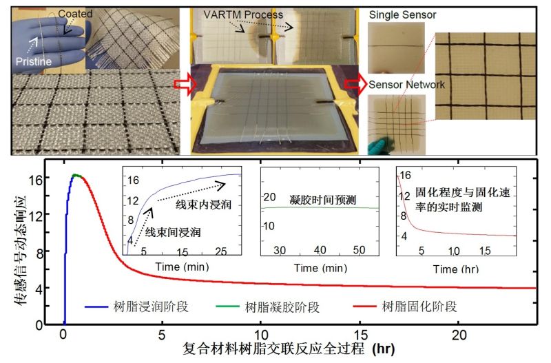 复材增强织布共编织、共固化的涂层纤维传感器。并对传感器微观形貌-电学信号-树脂交联反应之间的关系进行了系统研究,表明传感网络电学信号的动态变化可以有效地与树脂浸润模式与速度、凝胶时间、固化程度与速率等关键多物理参量关联。与差式温度扫描和流变等传统非原位检测方法相比,这一技术实现原位监测的同时,可以在不同固化温度、不同固化剂配比等多成型条件下进行监测应用。此外,该纤维传感单元可以扩展为矩阵式的传感网络来实现多点局部位置的状态扫描,对保障复合材料复杂大型结构件的工艺质量提供了技术基础。