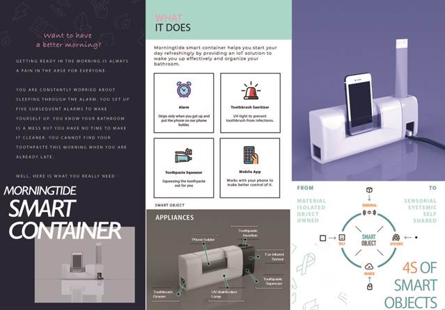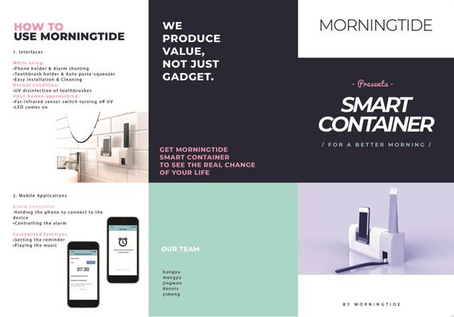 由Morningtide团队设计搭建的晨间效率提升站,是一款多功能IoT智能收纳盒,为有效唤醒上班族与学生党,协助收纳整理浴室提供了物联网解决方案,助力奋斗者以清新的早晨高效地开始新的一天。晨间效率提升站由手机APP智控,集感应闹钟与自动牙膏、洗漱用具与手机收纳、红外感应与紫外消毒于一身,满足青年奋斗者健康、高效、智控的需求。团队完成了一件商业前景广阔的敏捷产品设计与制造,也在过程中提升了综合管理、商业、设计、制造的综合实践能力。