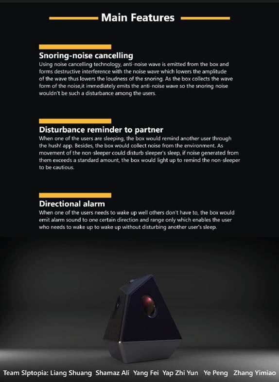 Slptopia团队从大学生宿舍生活的睡眠干扰现象的痛点出发,针对高密度人口城市中共享睡眠空间的人群(例如:住宿学生、换班职工)设计了一款名为Hush Box的智能情感化交互装置,旨在解决因不同作息时间、走动、声音而造成的睡眠干扰问题。产品以多面体呼吸灯的形式呈现,在不同面体上分布不同功能触发装置。主要功能为:主动降噪控制、通过APP及灯光变化提醒噪音来源方、睡眠检测和白噪音唤醒。在最终样机中,通过借助ANC等相关技术,产品可以在有限范围内实现噪音减小效果。