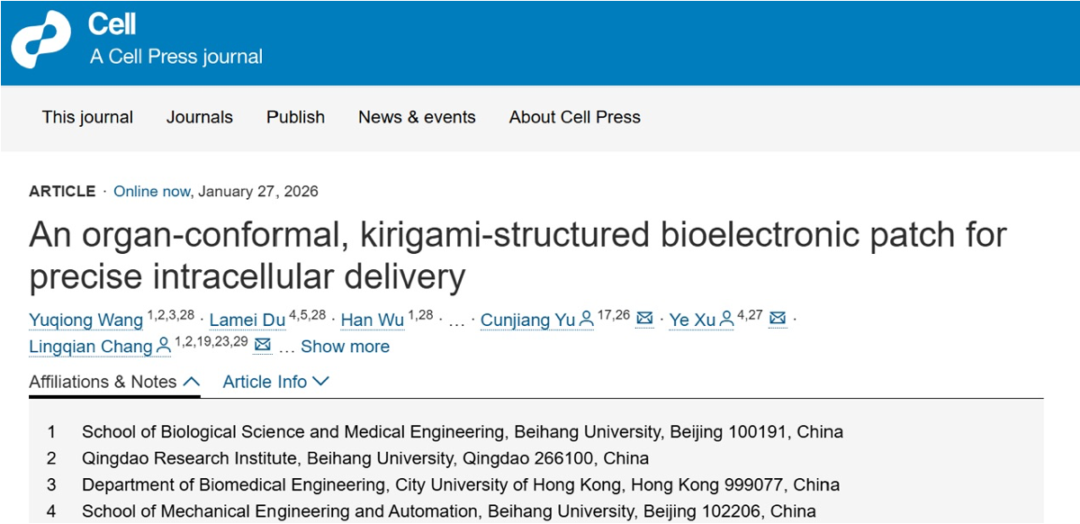 团队提出了基于“剪纸结构力学”的器官定制化共形理论,并构建出一款柔性高共形生物电子器件,实现了与复杂器官表面的精准贴合与高效药物/基因递送。研究成果以“An organ-conformal, kirigami-structured bioelectronic patch for precise intracellular delivery”为题,于2026年1月27日发表于《Cell》。