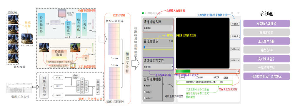 针对装配作业检测中,现有逐帧检测忽略前后运动趋势导致不同工序动作易重复难区分、正在使用和未使用零件工具难识别等问题,构建了基于光流和神经网络的装配动作及工具零件检测识别网络,提出了装配作业多模态信息建模方法,研究了装配作业多模态信息一致性判别方法,开发了基于结构化装配工艺文档与视频信息进行装配作业一致性检测的智能化系统,实现了基于装配工艺文件、装配作业视频等多模态信息识别的装配作业检测。